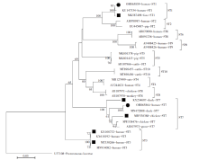 1.2.4 序列分析及系统发育分析 将测序校对后的序列与GenBank数据库中的基因序列比对, 确定芽囊原虫ST亚型。使用Mega7中Neighbor-Joining(NJ)法构建系统发育进化树, 基于Kimura two-parameter 模型计算遗传距离; 并通过1 000 次 bootstrap重复验证其的可靠性。