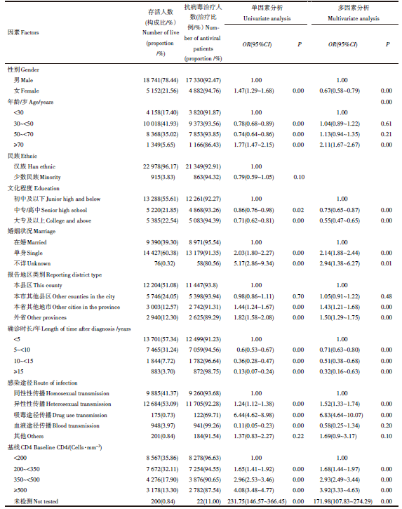 利用SPSS 21.0统计软件分析数据, 采用描述性统计分析患者性别、年龄、民族、传播途径等基本信息; 采用Logistic回归分析抗病毒治疗相关影响因素, 变量保留和剔除的标准分别是α =0.05和α =0.1, 以P< 0.05为差异有统计学意义。